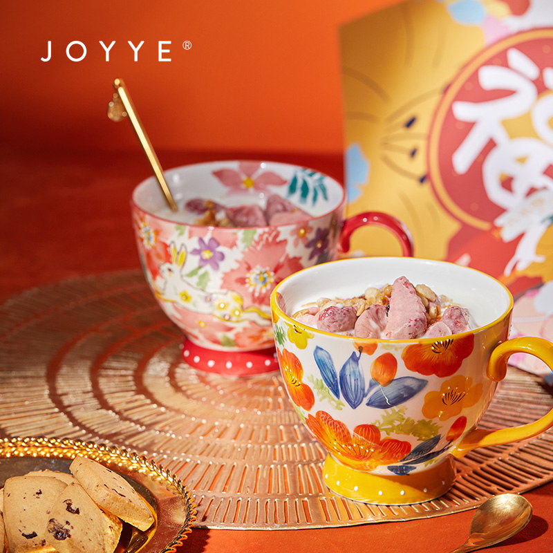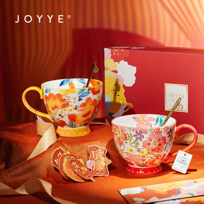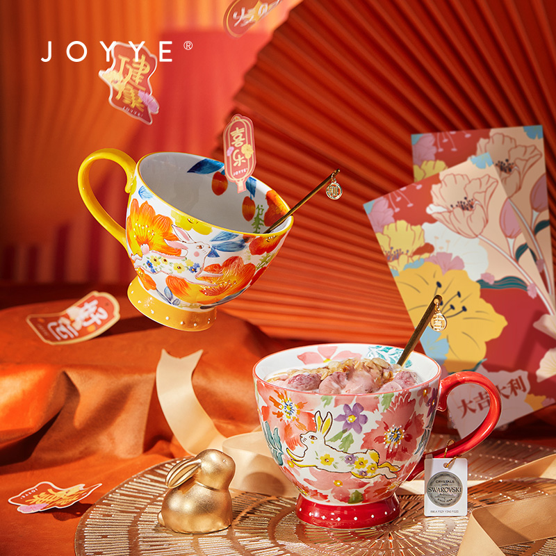 5.黄橘色杯身绘有杏花,杏与“幸”同音,赠缀有”财“的心意金勺,寓意财富和好运到来
